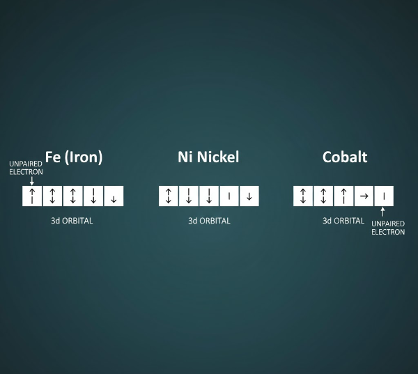 코발트(원자번호 27)는 [Ar] 3d⁷ 4s² 배치를 가지며 3개의 홀전자를, 니켈(원자번호 28)은 [Ar] 3d⁸ 4s² 배치를 가지며 2개의 홀전자를 가집니다. 이 짝 없는 홀전자들이 만드는 자기장은 상쇄될 상대가 없어 그대로 살아남게 되고, 이것이 원자 하나하나를 강력한 원자 자석으로 만듭니다.